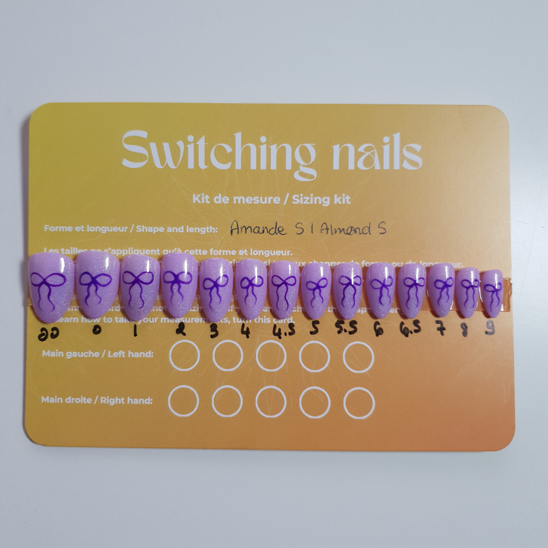 Design: pastel purple background, holographic finish, dark purple ribbon