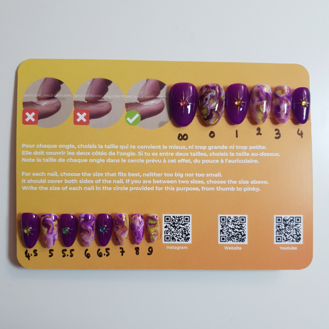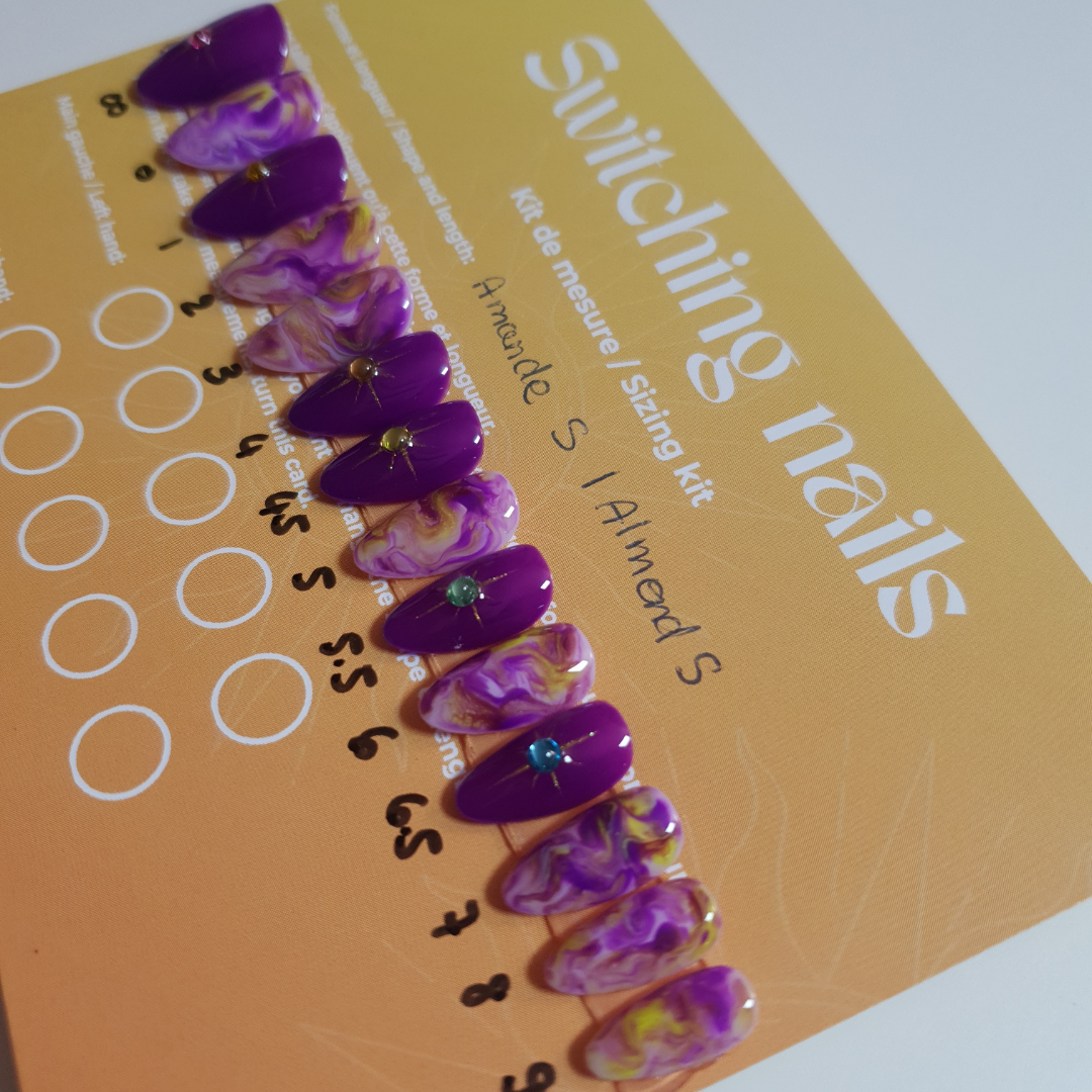 Design: dark purple background with gold star and strass, purples and yellow marble effect
